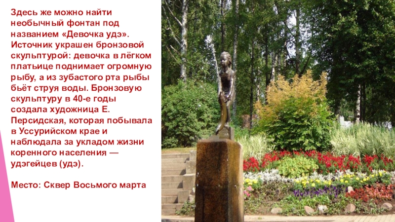 Слайд 12Здесь же можно найти необычный фонтан под названием «Девочка удэ». Источник
