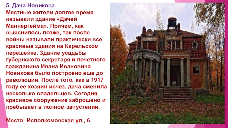 как выяснилось позже, так после войны называли практически все красивые здания на Карельском перешейке. Здание усадьбы губернского секретаря и почетного гражданина Ивана Ивановича Новикова было построено еще до революции. После того, как в 1917 году ее хозяин исчез, дача сменила несколько владельцев. Сегодня красивое сооружение заброшено и пребывает в полном запустении.