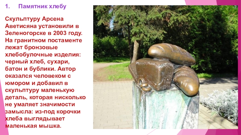 2003 году. На гранитном постаменте лежат бронзовые хлебобулочные изделия: черный хлеб, сухари, батон и бублики. Автор оказался человеком с юмором и добавил в скульптуру маленькую деталь, которая нисколько не умаляет значимости замысла: из-под корочки хлеба выглядывает маленькая мышка.