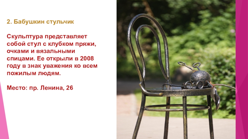 Скульптура представляет собой стул с клубком пряжи, очками и