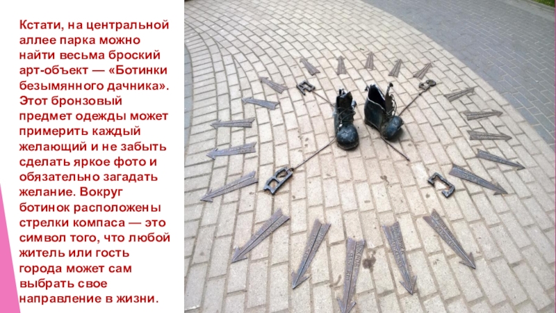 Слайд 15Кстати, на центральной аллее парка можно найти весьма броский арт-объект —