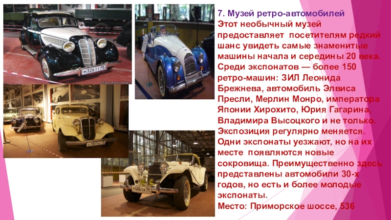 знаменитые машины начала и середины 20 века. Среди экспонатов — более 150 ретро-машин: ЗИЛ Леонида Брежнева, автомобиль Элвиса Пресли, Мерлин Монро, императора Японии Хирохито, Юрия Гагарина, Владимира Высоцкого и не только. Экспозиция регулярно меняется. Одни экспонаты уезжают, но на их месте появляются новые сокровища. Преимущественно здесь представлены автомобили 30-х годов, но есть и более молодые экспонаты.