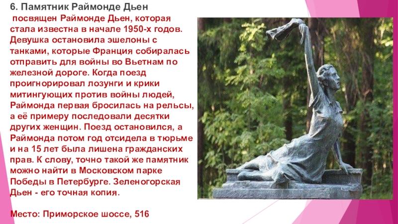 начале 1950-х годов. Девушка остановила эшелоны с танками, которые Франция собиралась отправить для войны во Вьетнам по железной дороге. Когда поезд проигнорировал лозунги и крики митингующих против войны людей, Раймонда первая бросилась на рельсы, а её примеру последовали десятки других женщин. Поезд остановился, а Раймонда потом год отсидела в тюрьме и на 15 лет была лишена гражданских прав. К слову, точно такой же памятник можно найти в Московском парке Победы в Петербурге. Зеленогорская Дьен - его точная копия.
