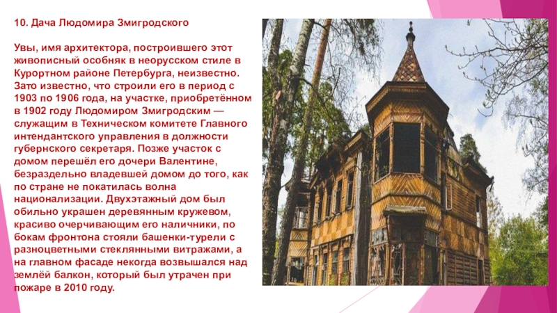 неорусском стиле в Курортном районе Петербурга, неизвестно. Зато известно, что строили его в период с 1903 по 1906 года, на участке, приобретённом в 1902 году Людомиром Змигродским — служащим в Техническом комитете Главного интендантского управления в должности губернского секретаря. Позже участок с домом перешёл его дочери Валентине, безраздельно владевшей домом до того, как по стране не покатилась волна национализации. Двухэтажный дом был обильно украшен деревянным кружевом, красиво очерчивающим его наличники, по бокам фронтона стояли башенки-турели с разноцветными стеклянными витражами, а на главном фасаде некогда возвышался над землёй балкон, который был утрачен при пожаре в 2010 году.