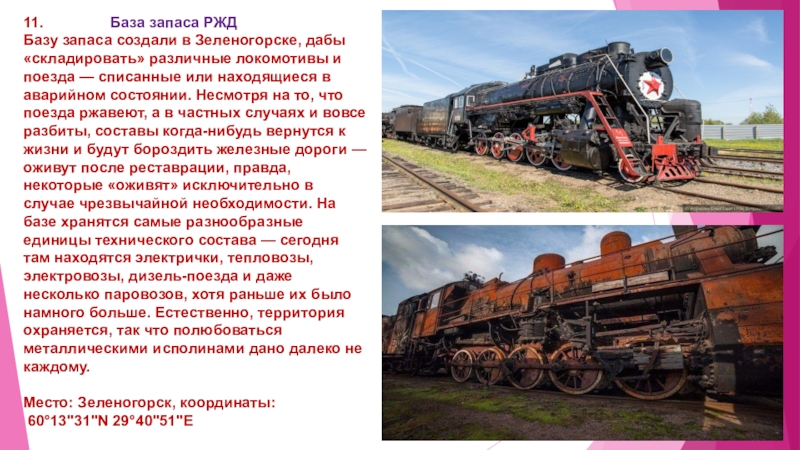 запаса создали в Зеленогорске, дабы «складировать» различные локомотивы и поезда — списанные или находящиеся в аварийном состоянии. Несмотря на то, что поезда ржавеют, а в частных случаях и вовсе разбиты, составы когда-нибудь вернутся к жизни и будут бороздить железные дороги — оживут после реставрации, правда, некоторые «оживят» исключительно в случае чрезвычайной необходимости. На базе хранятся самые разнообразные единицы технического состава — сегодня там находятся электрички, тепловозы, электровозы, дизель-поезда и даже несколько паровозов, хотя раньше их было намного больше. Естественно, территория охраняется, так что полюбоваться металлическими исполинами дано далеко не каждому.