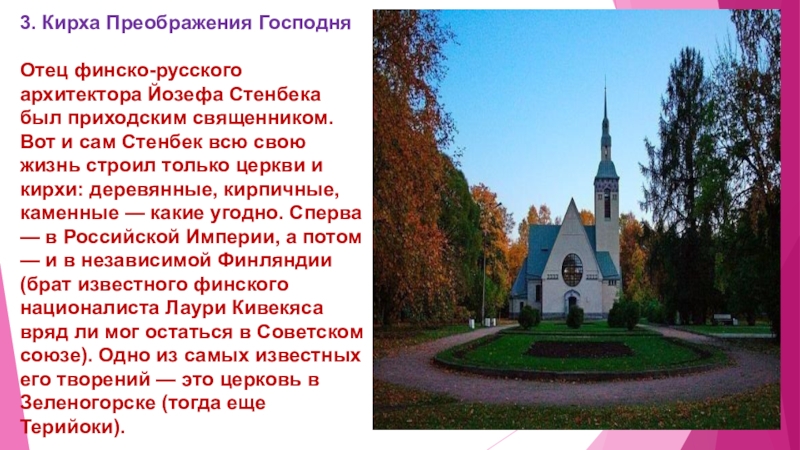 Вот и сам Стенбек всю свою жизнь строил только церкви и кирхи: деревянные, кирпичные, каменные — какие угодно. Сперва — в Российской Империи, а потом — и в независимой Финляндии (брат известного финского националиста Лаури Кивекяса вряд ли мог остаться в Советском союзе). Одно из самых известных его творений — это церковь в Зеленогорске (тогда еще Терийоки).