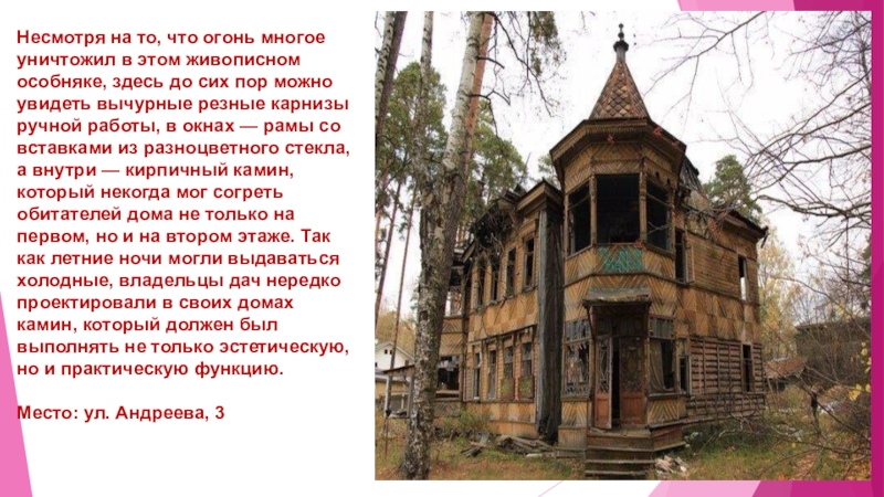 здесь до сих пор можно увидеть вычурные резные карнизы ручной работы, в окнах — рамы со вставками из разноцветного стекла, а внутри — кирпичный камин, который некогда мог согреть обитателей дома не только на первом, но и на втором этаже. Так как летние ночи могли выдаваться холодные, владельцы дач нередко проектировали в своих домах камин, который должен был выполнять не только эстетическую, но и практическую функцию.