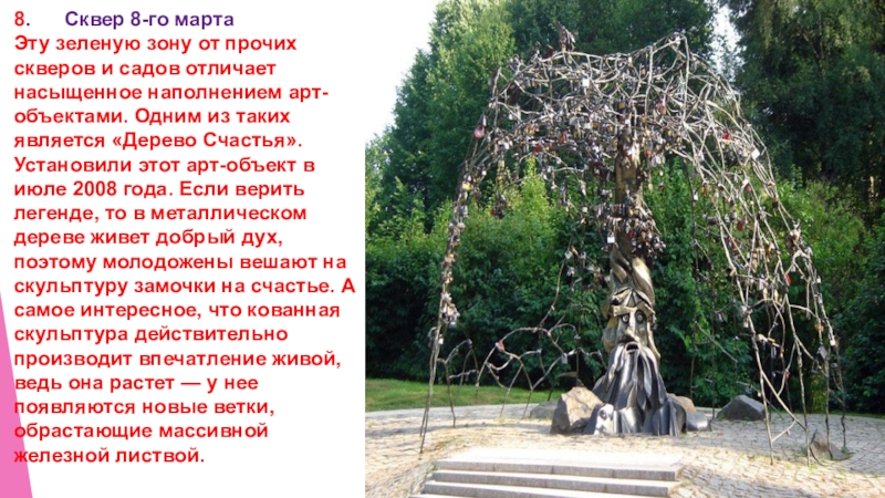 и садов отличает насыщенное наполнением арт-объектами. Одним из таких является «Дерево Счастья». Установили этот арт-объект в июле 2008 года. Если верить легенде, то в металлическом дереве живет добрый дух, поэтому молодожены вешают на скульптуру замочки на счастье. А самое интересное, что кованная скульптура действительно производит впечатление живой, ведь она растет — у нее появляются новые ветки, обрастающие массивной железной листвой.