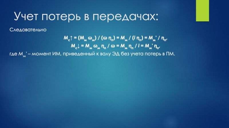 Мс↓ = Мм ωм ηп / ω = Мм ηп / i = Мм' ηп,