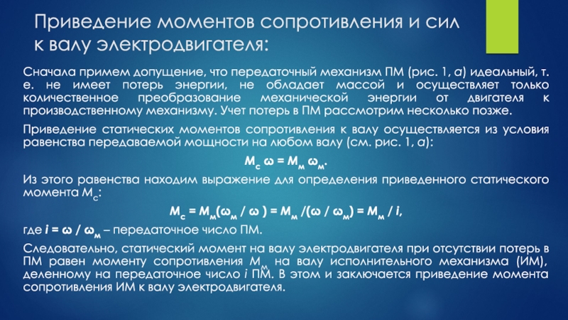 Слайд 5Приведение моментов сопротивления и сил к валу электродвигателя: