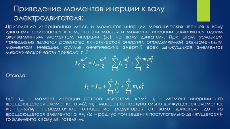 Слайд 6Приведение моментов инерции к валу электродвигателя: