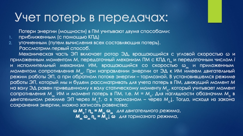 Механическая часть ЭП включает ротор ЭД, вращающийся с угловой скоростью ω и приложенным моментом М, передаточный механизм ПМ с КПД ηп и передаточным числом i и исполнительный механизм ИМ, вращающийся со скоростью ωм и приложенным моментом сопротивления Мм. При направлении энергии от ЭД к ИМ имеем двигательный режим работы ЭП, а при обратном потоке энергии – тормозной. В установившемся режиме работы ЭП, который мы и будем рассматривать для учета потерь в ПМ, движущий момент М на валу ЭД равен приведенному к валу статическому моменту Мс, который учитывает момент сопротивления Мм ИМ и момент потерь в ПМ, т.е. М = Мс. Для наглядности обозначим Мс в двигательном режиме ЭП через Мс↑, а в тормозном – через Мс↓. Тогда, исходя из закона сохранения энергии, можно записать равенства:
