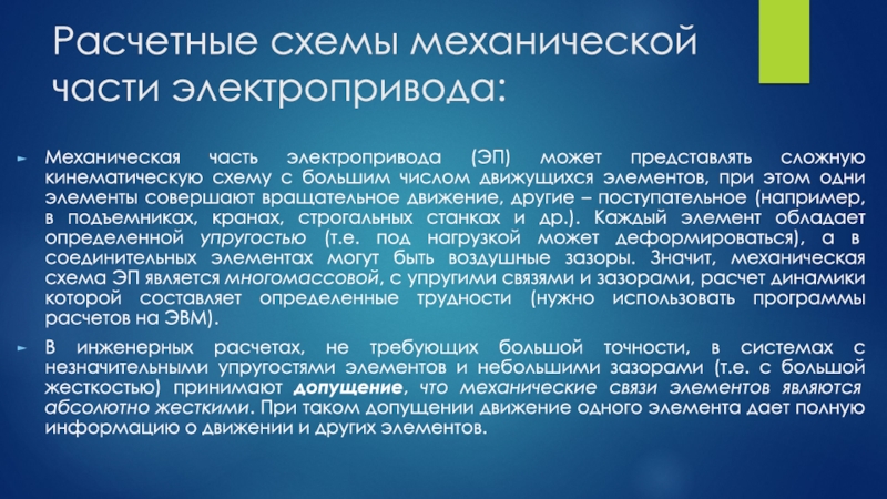 кинематическую схему с большим числом движущихся элементов, при этом одни элементы совершают вращательное движение, другие – поступательное (например, в подъемниках, кранах, строгальных станках и др.). Каждый элемент обладает определенной упругостью (т.е. под нагрузкой может деформироваться), а в соединительных элементах могут быть воздушные зазоры. Значит, механическая схема ЭП является многомассовой, с упругими связями и зазорами, расчет динамики которой составляет определенные трудности (нужно использовать программы расчетов на ЭВМ).