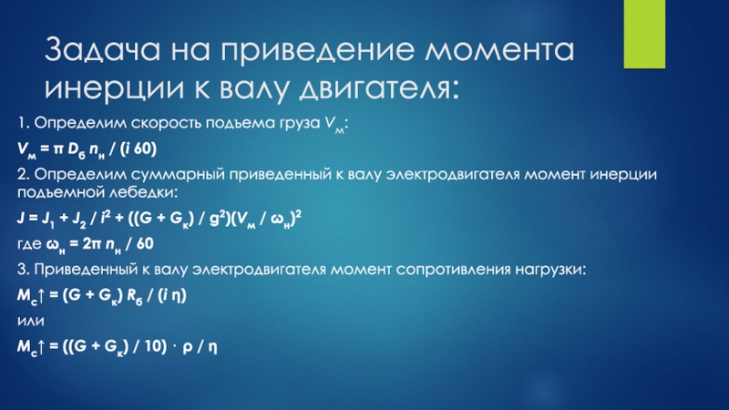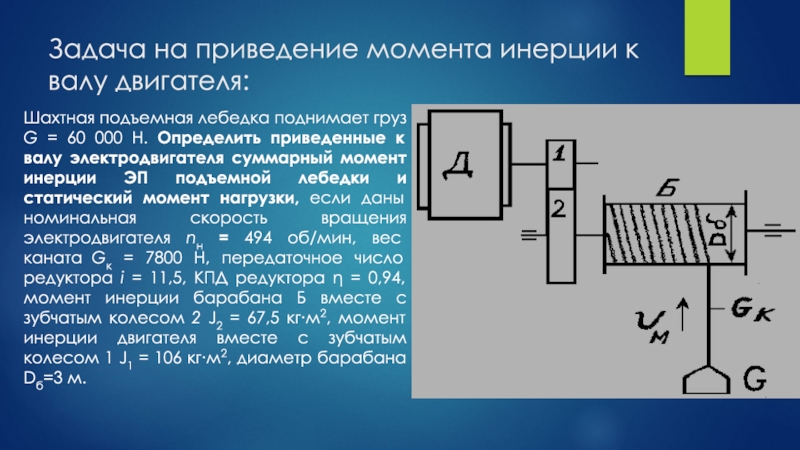 Слайд 9Задача на приведение момента инерции к валу двигателя:
