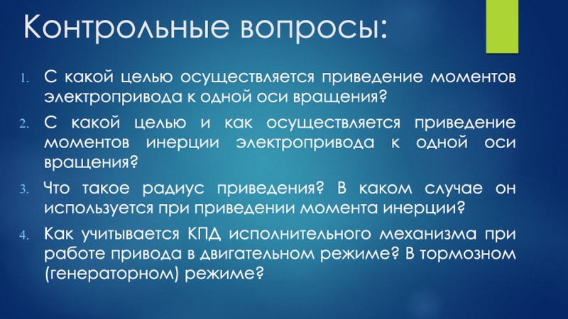 Слайд 4Приведение моментов сопротивления и сил к валу электродвигателя: