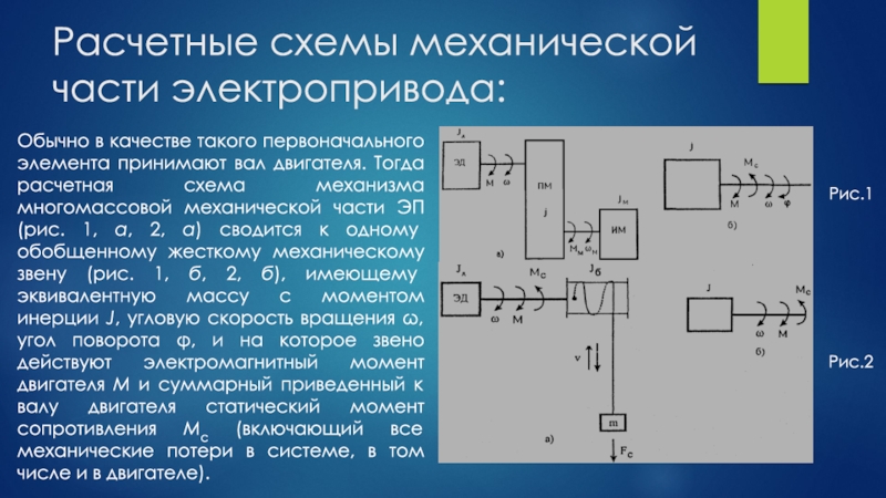 вал двигателя. Тогда расчетная схема механизма многомассовой механической части ЭП (рис. 1, а, 2, а) сводится к одному обобщенному жесткому механическому звену (рис. 1, б, 2, б), имеющему эквивалентную массу с моментом инерции J, угловую скорость вращения ω, угол поворота φ, и на которое звено действуют электромагнитный момент двигателя М и суммарный приведенный к валу двигателя статический момент сопротивления Мс (включающий все механические потери в системе, в том числе и в двигателе).