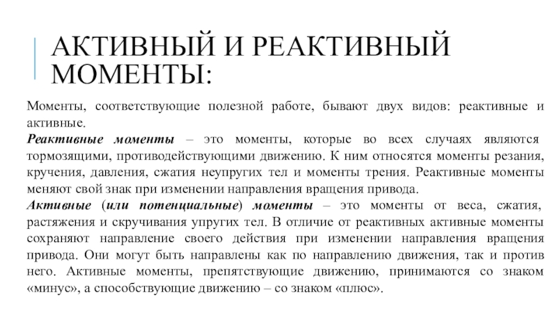 Активные (или потенциальные) моменты – это моменты от веса, сжатия, растяжения и скручивания упругих тел. В отличие от реактивных активные моменты сохраняют направление своего действия при изменении направления вращения привода. Они могут быть направлены как по направлению движения, так и против него. Активные моменты, препятствующие движению, принимаются со знаком «минус», а способствующие движению – со знаком «плюс».