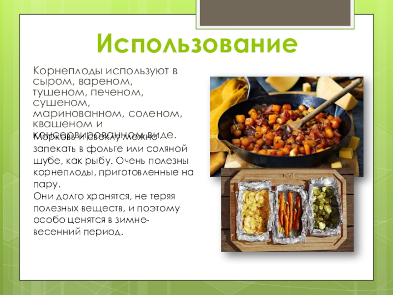 Корнеплоды используют в сыром, вареном, тушеном, печеном, сушеном, маринованном, соленом,