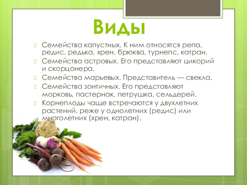 Корнеплоды чаще встречаются у двухлетних растений, реже у однолетних (редис) или многолетних (хрен, катран).