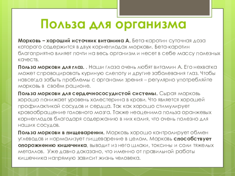 Польза моркови в пищеварении. Морковь хорошо контролирует обмен углеводов и нормализует пищеварение в целом. Морковь способствует опорожнению кишечника, выводит из него шлаки, токсины и соли тяжелых металлов. Уже давно доказано, что именно от правильной работы кишечника напрямую зависит жизнь человека.