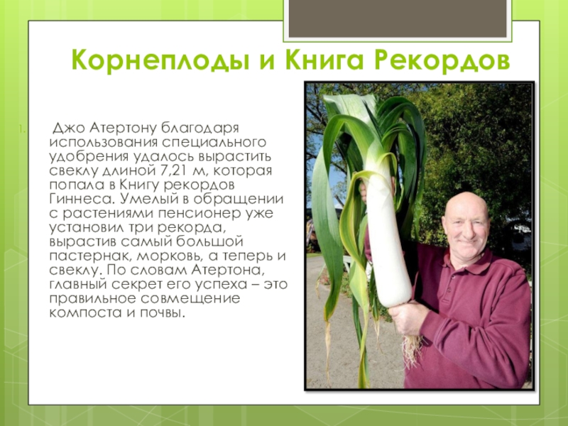 вырастить свеклу длиной 7,21 м, которая попала в Книгу рекордов Гиннеса. Умелый в обращении с растениями пенсионер уже установил три рекорда, вырастив самый большой пастернак, морковь, а теперь и свеклу. По словам Атертона, главный секрет его успеха – это правильное совмещение компоста и почвы.