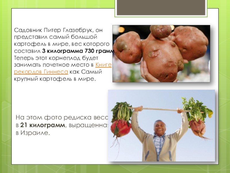 Слайд 13На этом фото редиска весом в 21 килограмм, выращенная в Израиле.