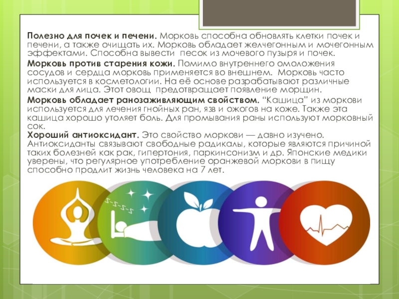Слайд 11Полезно для почек и печени. Морковь способна обновлять клетки почек и печени,