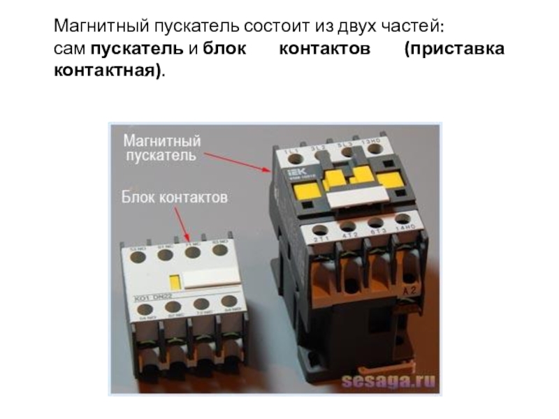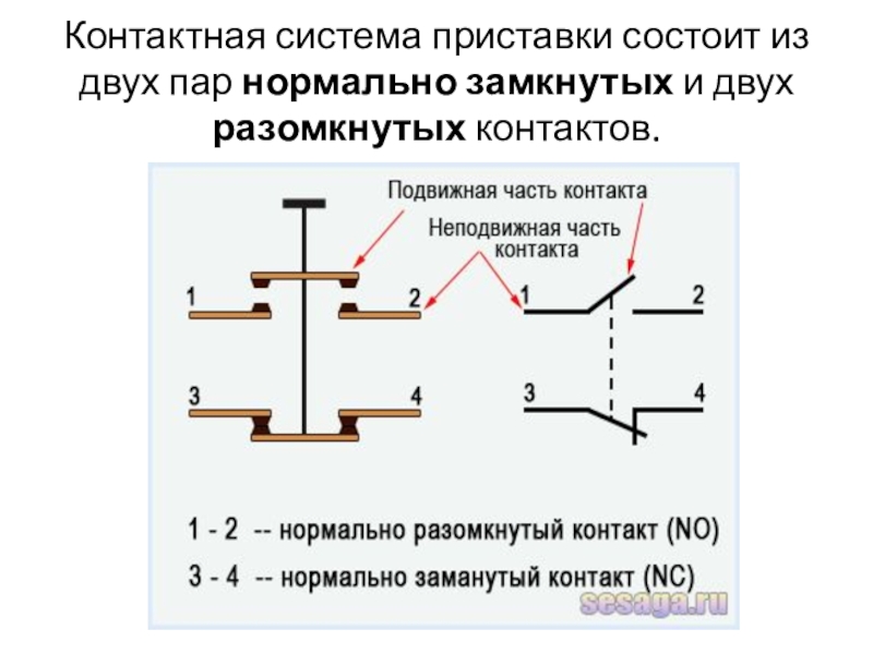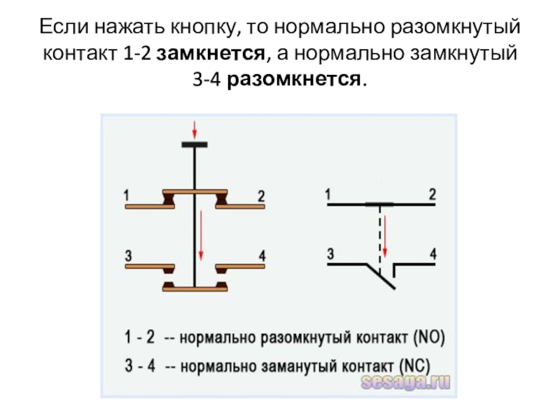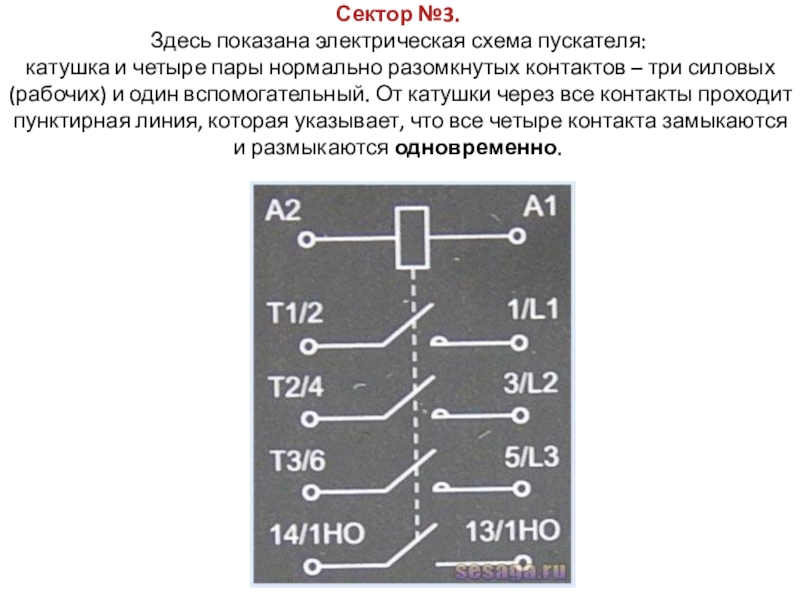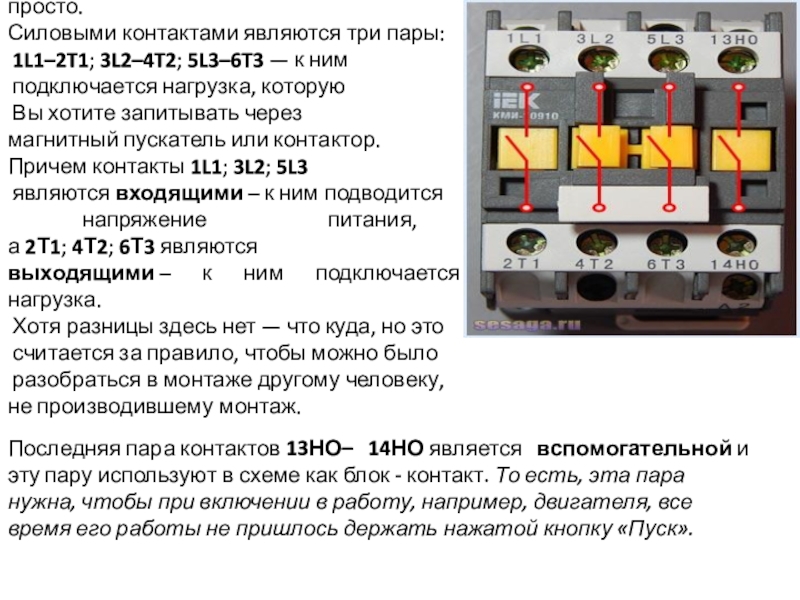 Последняя пара контактов 13НО– 14НО является вспомогательной и эту пару используют в схеме как блок - контакт. То есть, эта пара нужна, чтобы при включении в работу, например, двигателя, все время его работы не пришлось держать нажатой кнопку «Пуск».