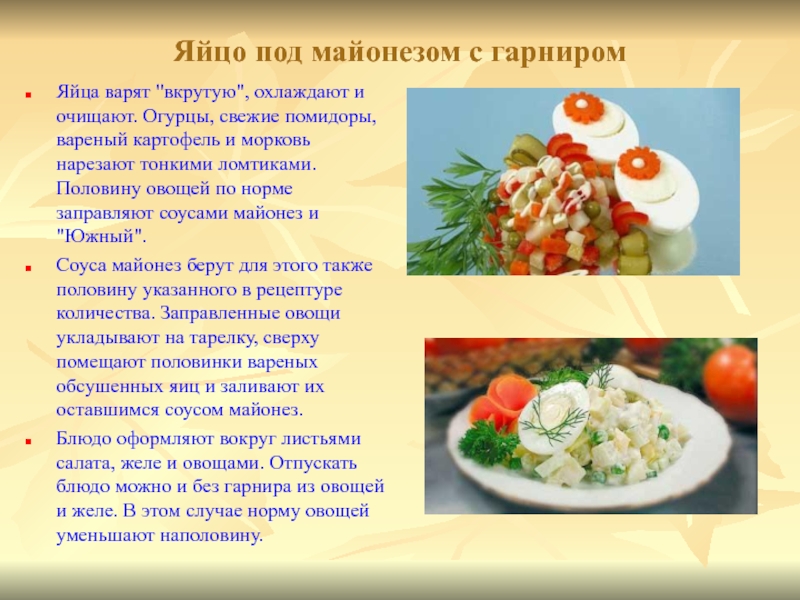Мясные или рыбные продукты дополняют овощами, зеленью, яйцами, маслинами.