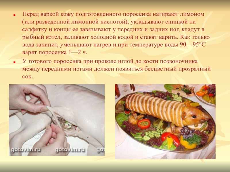 Перед варкой кожу подготовленного поросенка натирают лимоном (или разведенной лимонной кислотой),