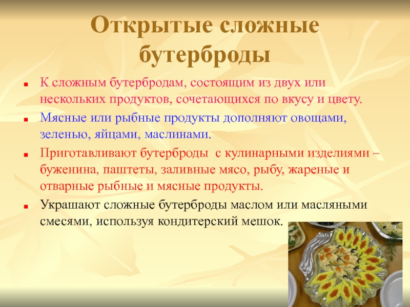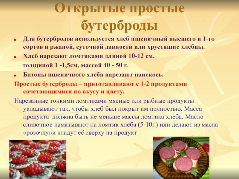 Нарезанные тонкими ломтиками мясные или рыбные продукты укладывают так, чтобы хлеб был покрыт им полностью. Масса продукта должна быть не меньше массы ломтика хлеба. Масло сливочное намазывают на ломтик хлеба (5-10г.) или делают из масла «розочку»и кладут её сверху на продукт