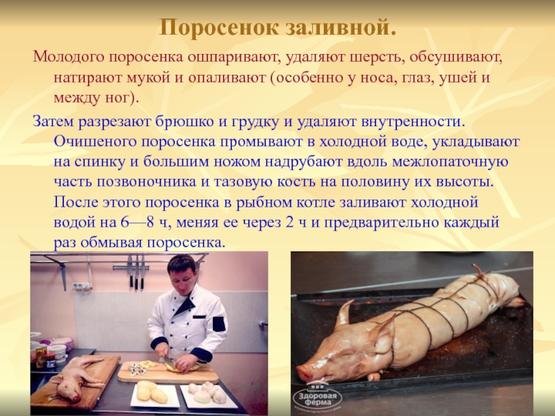Затем разрезают брюшко и грудку и удаляют внутренности. Очишеного поросенка промывают в холодной воде, укладывают на спинку и большим ножом надрубают вдоль межлопаточную часть позвоночника и тазовую кость на половину их высоты. После этого поросенка в рыбном котле заливают холодной водой на 6—8 ч, меняя ее через 2 ч и предварительно каждый раз обмывая поросенка.
