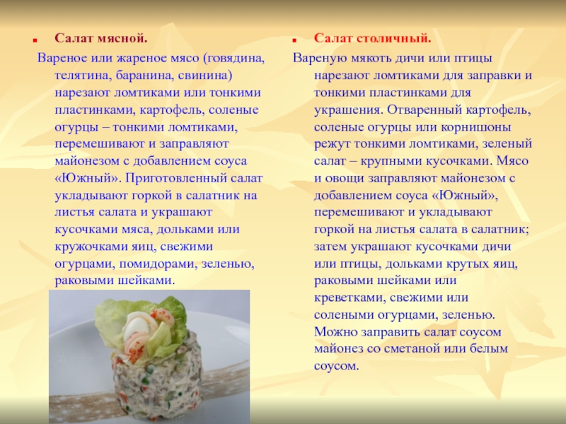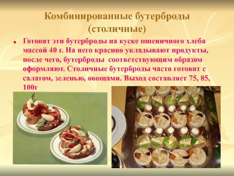 г. На него красиво укладывают продукты, после чего, бутерброды соответствующим образом оформляют. Столичные бутерброды часто готовят с салатом, зеленью, овощами. Выход составляет 75, 85, 100г