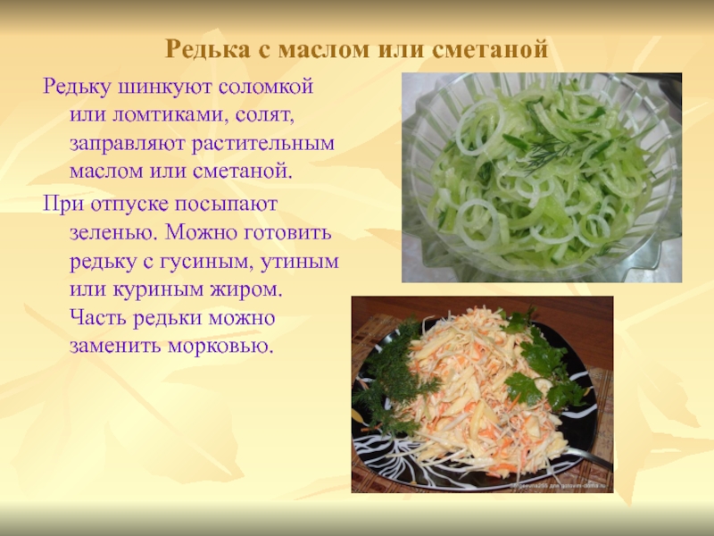 Для салатов и винегретов картофель, свеклу, морковь отваривают в кожице, а репу без кожицы (очищенной), или очищенные и нарезанные овощи припускают с небольшим количеством воды (10 %) до готовности. Отваренные и сырые овощи для салатов и винегретов можно нарезать в виде кубиков, ломтиков, кружочков, соломки. Подготовленные овощи охлаждают до температуры 8—10°.