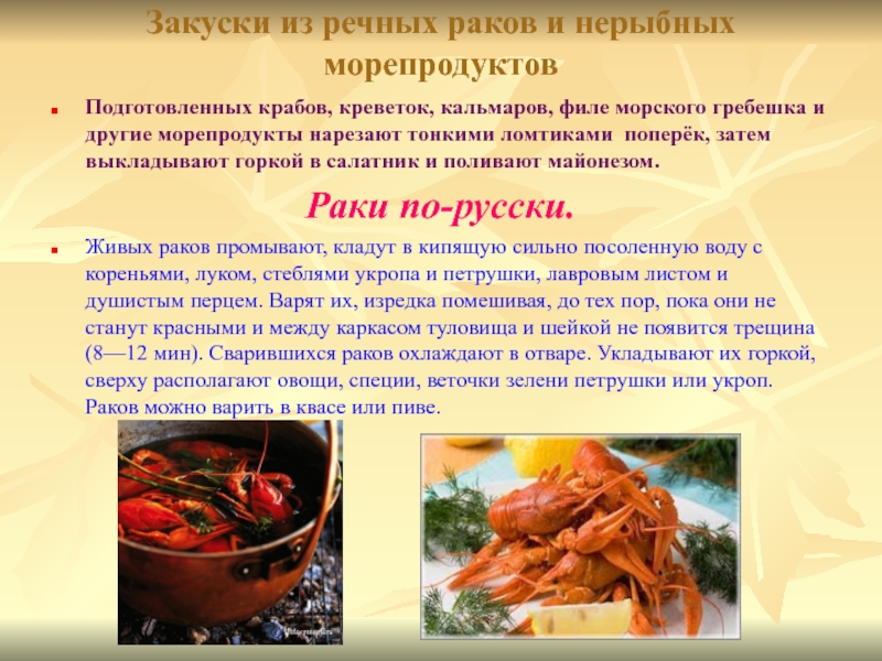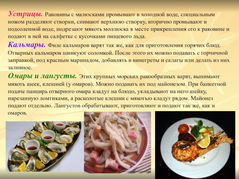 Омары и лангусты. Этих крупных морских ракообразных варят, вынимают мякоть шеек, клешней (у омаров). Можно подавать их под майонезом. При банкетной подаче панцирь отварного омара кладут на блюдо, укладывают на него шейку, нарезанную ломтиками, а расколотые клешни с мякотью кладут рядом. Майонез подают отдельно. Лангустов обрабатывают, приготовляют и подают так же, как и омаров.