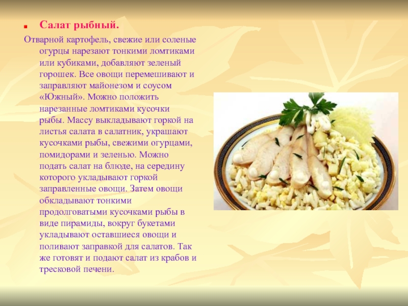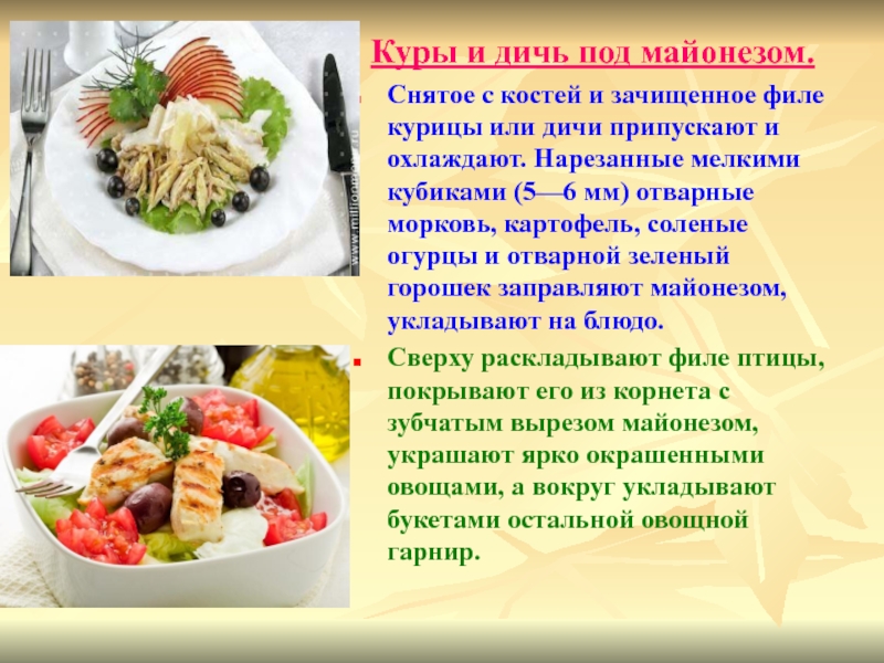 курицы или дичи припускают и охлаждают. Нарезанные мелкими кубиками (5—6 мм) отварные морковь, картофель, соленые огурцы и отварной зеленый горошек заправляют майонезом, укладывают на блюдо.