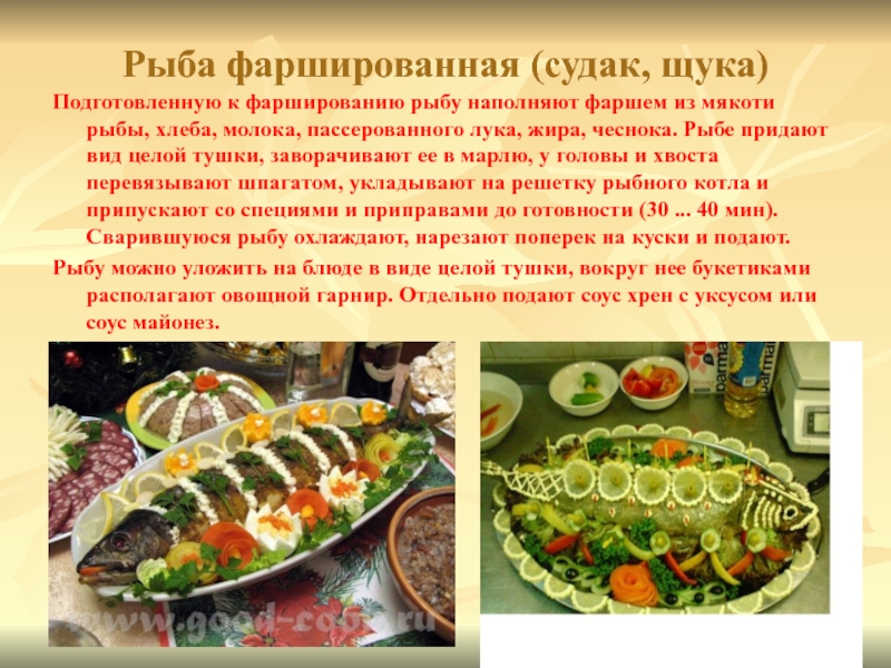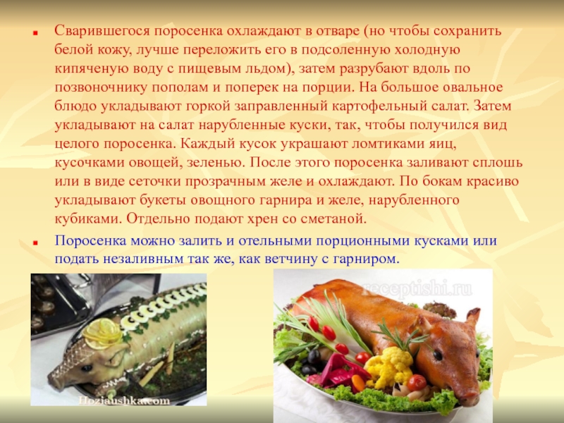 переложить его в подсоленную холодную кипяченую воду с пищевым льдом), затем разрубают вдоль по позвоночнику пополам и поперек на порции. На большое овальное блюдо укладывают горкой заправленный картофельный салат. Затем укладывают на салат нарубленные куски, так, чтобы получился вид целого поросенка. Каждый кусок украшают ломтиками яиц, кусочками овощей, зеленью. После этого поросенка заливают сплошь или в виде сеточки прозрачным желе и охлаждают. По бокам красиво укладывают букеты овощного гарнира и желе, нарубленного кубиками. Отдельно подают хрен со сметаной.
