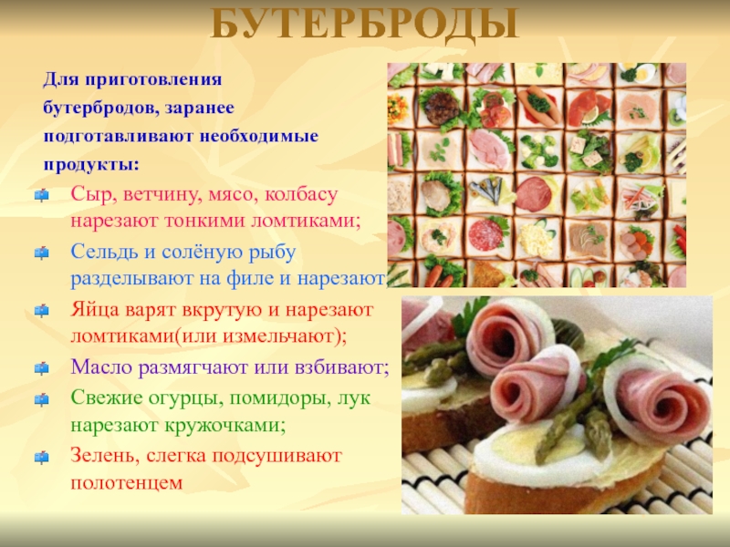 Приготавливают бутерброды с кулинарными изделиями – буженина, паштеты, заливные мясо, рыбу, жареные и отварные рыбные и мясные продукты.