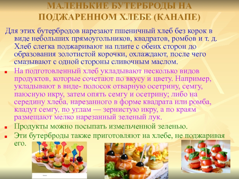 Слайд 18МАЛЕНЬКИЕ БУТЕРБРОДЫ НА ПОДЖАРЕННОМ ХЛЕБЕ (КАНАПЕ)