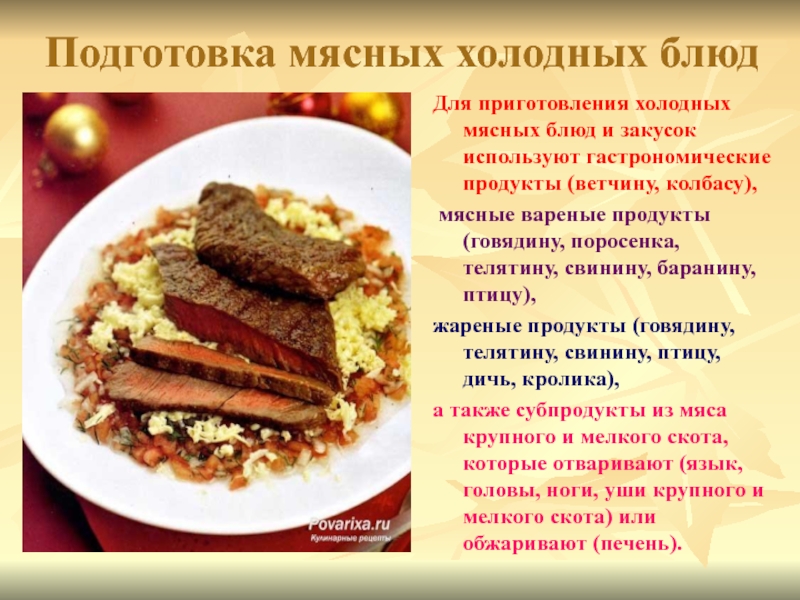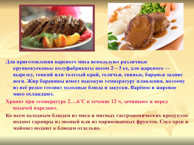 для жареного — вырезку, тонкий или толстый край, телячьи, свиные, бараньи задние ноги. Жир баранины имеет высокую температуру плавления, поэтому из неё редко готовят холодные блюда и закуски. Варёное и жареное мясо охлаждают.