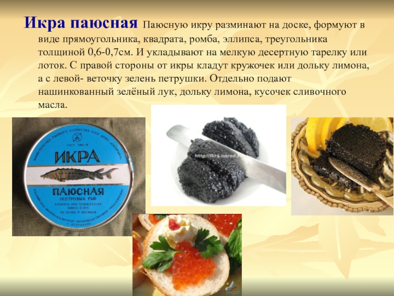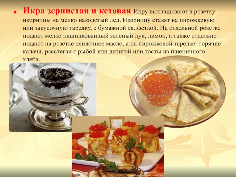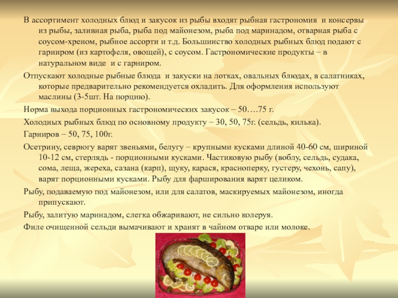 Холодные закуски имеют меньший выход, подают их без гарнира (икра, шпроты), или с небольшим его количеством (сельдь, килька с луком)