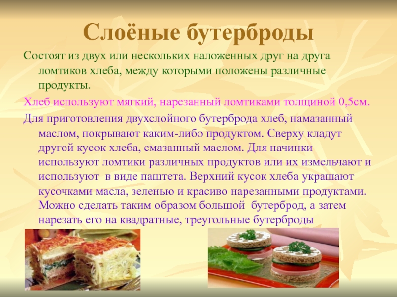 Для приготовления двухслойного бутерброда хлеб, намазанный маслом, покрывают каким-либо продуктом. Сверху кладут другой кусок хлеба, смазанный маслом. Для начинки используют ломтики различных продуктов или их измельчают и используют в виде паштета. Верхний кусок хлеба украшают кусочками масла, зеленью и красиво нарезанными продуктами. Можно сделать таким образом большой бутерброд, а затем нарезать его на квадратные, треугольные бутерброды
