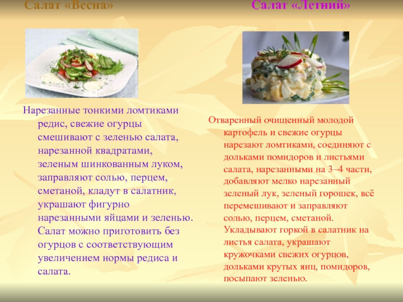 смеси различных овощей, как правило, без свеклы, заправленное соусом майонез, заправкой или сметаной. Винегреты являются разновидностью салатов, но приготовляют винегреты обязательно со свеклой и заправляют горчичной заправкой, а иногда сметаной.