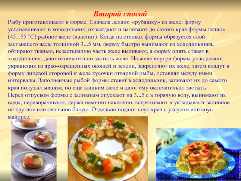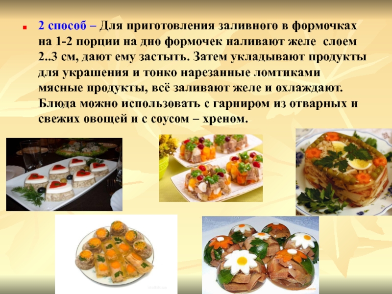 на дно формочек наливают желе слоем 2..3 см, дают ему застыть. Затем укладывают продукты для украшения и тонко нарезанные ломтиками мясные продукты, всё заливают желе и охлаждают. Блюда можно использовать с гарниром из отварных и свежих овощей и с соусом – хреном.