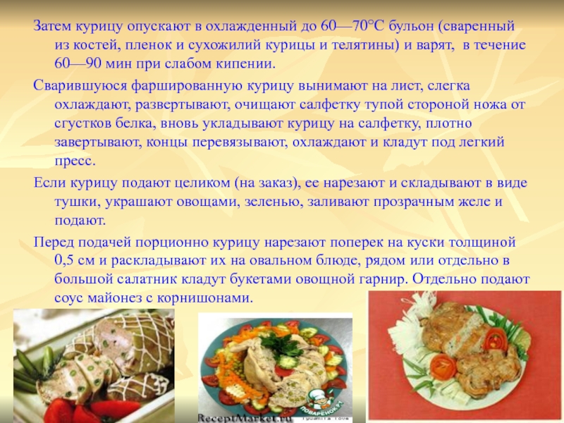 Сварившуюся фаршированную курицу вынимают на лист, слегка охлаждают, развертывают, очищают салфетку тупой стороной ножа от сгустков белка, вновь укладывают курицу на салфетку, плотно завертывают, концы перевязывают, охлаждают и кладут под легкий пресс.