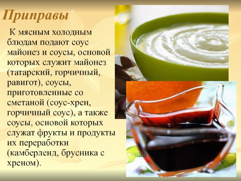 К мясным холодным блюдам подают соус майонез и соусы, основой