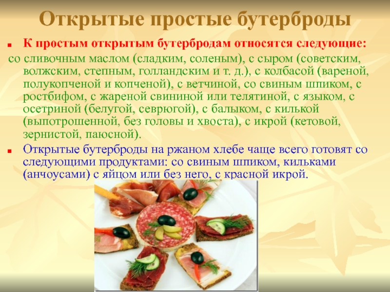 Простые бутерброды – приготавливают с 1-2 продуктами сочетающимися по вкусу и цвету.