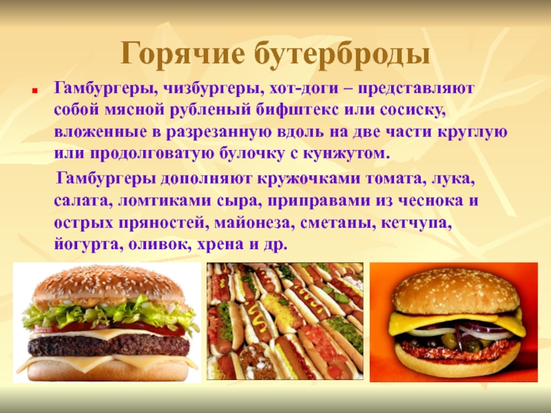 Гамбургеры, чизбургеры, хот-доги – представляют собой мясной рубленый бифштекс или