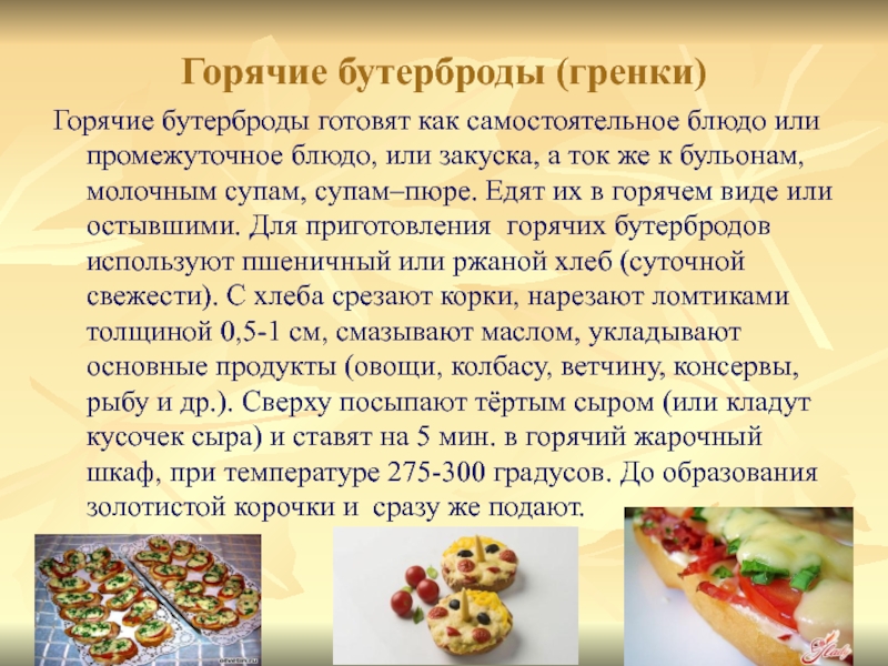 или закуска, а ток же к бульонам, молочным супам, супам–пюре. Едят их в горячем виде или остывшими. Для приготовления горячих бутербродов используют пшеничный или ржаной хлеб (суточной свежести). С хлеба срезают корки, нарезают ломтиками толщиной 0,5-1 см, смазывают маслом, укладывают основные продукты (овощи, колбасу, ветчину, консервы, рыбу и др.). Сверху посыпают тёртым сыром (или кладут кусочек сыра) и ставят на 5 мин. в горячий жарочный шкаф, при температуре 275-300 градусов. До образования золотистой корочки и сразу же подают.