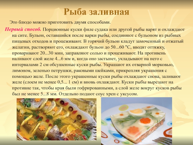 1 способ: При массовом приготовлении на противень или лоток наливают тонким слоем желе и, когда оно слегка застынет, кладут на него нарезанные мясные продукты (отварной язык, жареное или отварное мясо, отварные птицу или поросёнка). Украшают зеленью, отварными и свежими овощами, лимоном, варёным яйцом. Украшения закрепляют остывшим желе, а затем заливают блюдо слоем 0,3…0,5 см. Когда желе застынет, вырезают порции так, чтобы вокруг мясных продуктов было желе слоем 1…1,5 см.